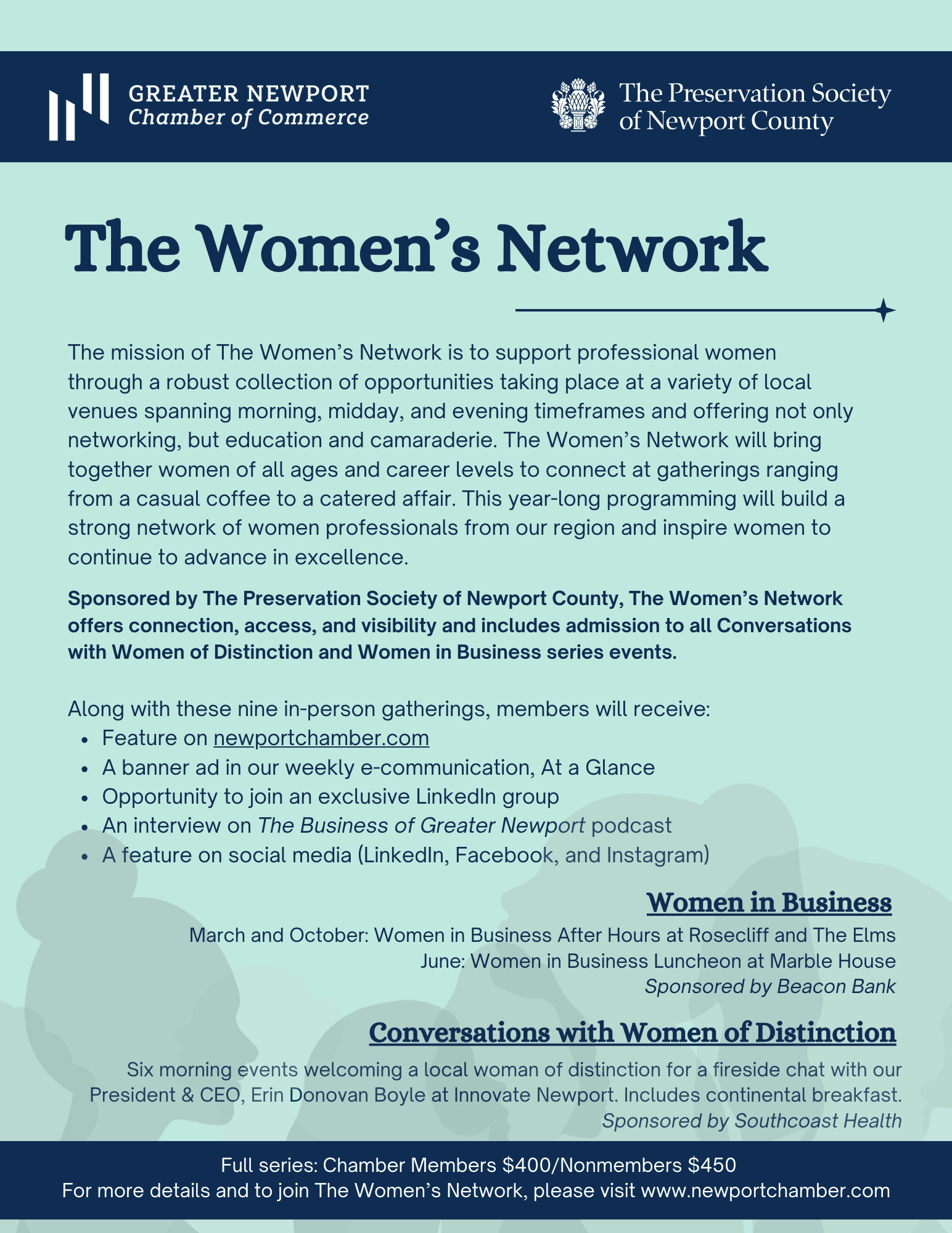 Sponsored by The Preservation Society of Newport County, The Women’s Network offers connection, access, and visibility and includes admission to all Conversations with Women of Distinction and Women in Business series events.